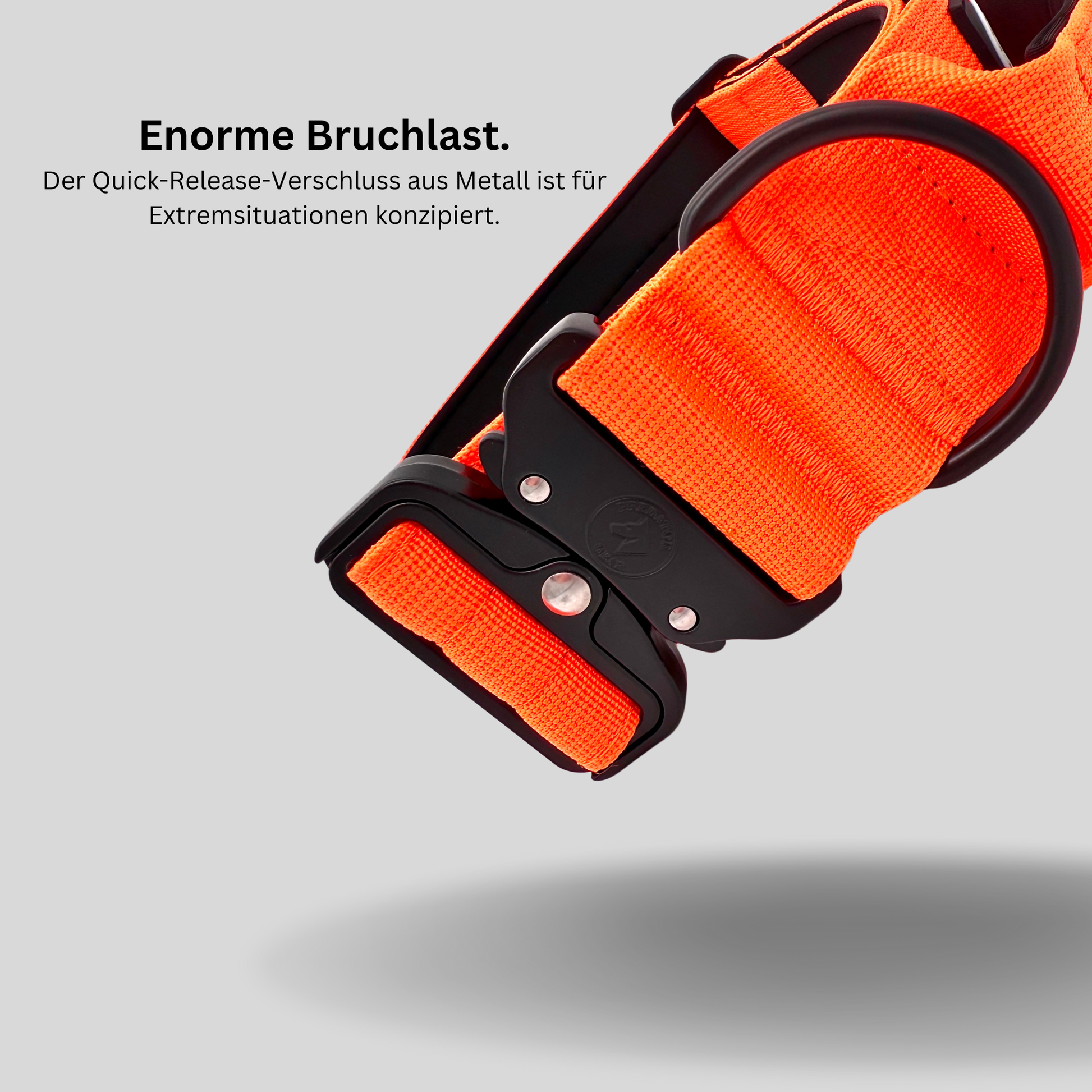 Gefertigt aus robustem Nylon mit Neopren-Komfortpolsterung und charakteristischem Quick-Release-Verschluss, ist es mehr als nur ein Halsband - es ist Teil deiner Ausrüstung. Herzstück ist der hochwertige Metallverschluss mit Quick-Release-Funktion