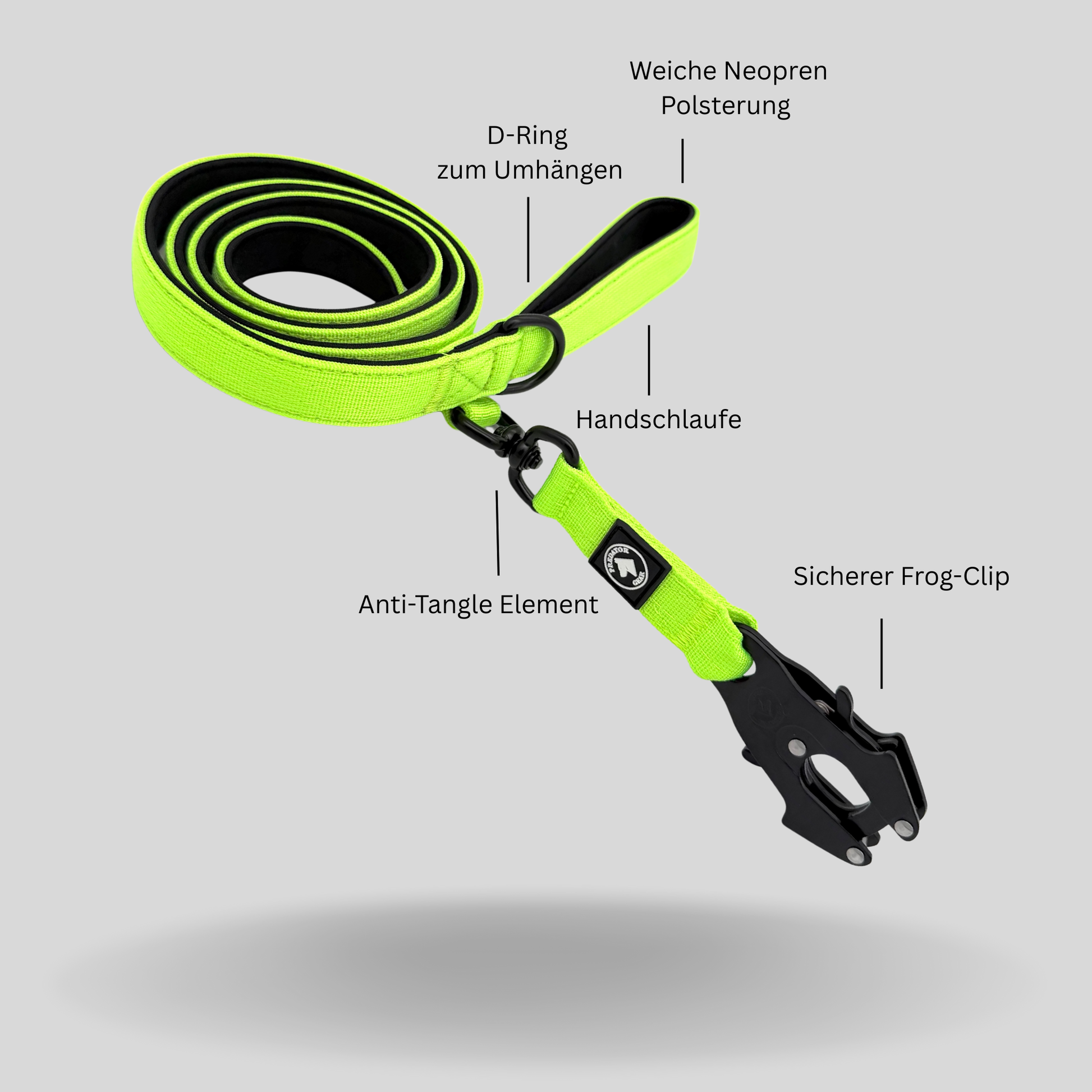 Gefertigt aus robustem Nylon mit Neopren-Komfortpolsterung und charakteristischem Froschkarabiner, ist sie mehr als nur eine Leine - sie ist Teil deiner Ausrüstung. Der hochwertige Verschluss rastet bei Berührung mit dem Anschlagpunkt automatisch ein - für schnelle einhändige Sicherung & starken Halt auch unter Zug oder in kritischen Momenten.