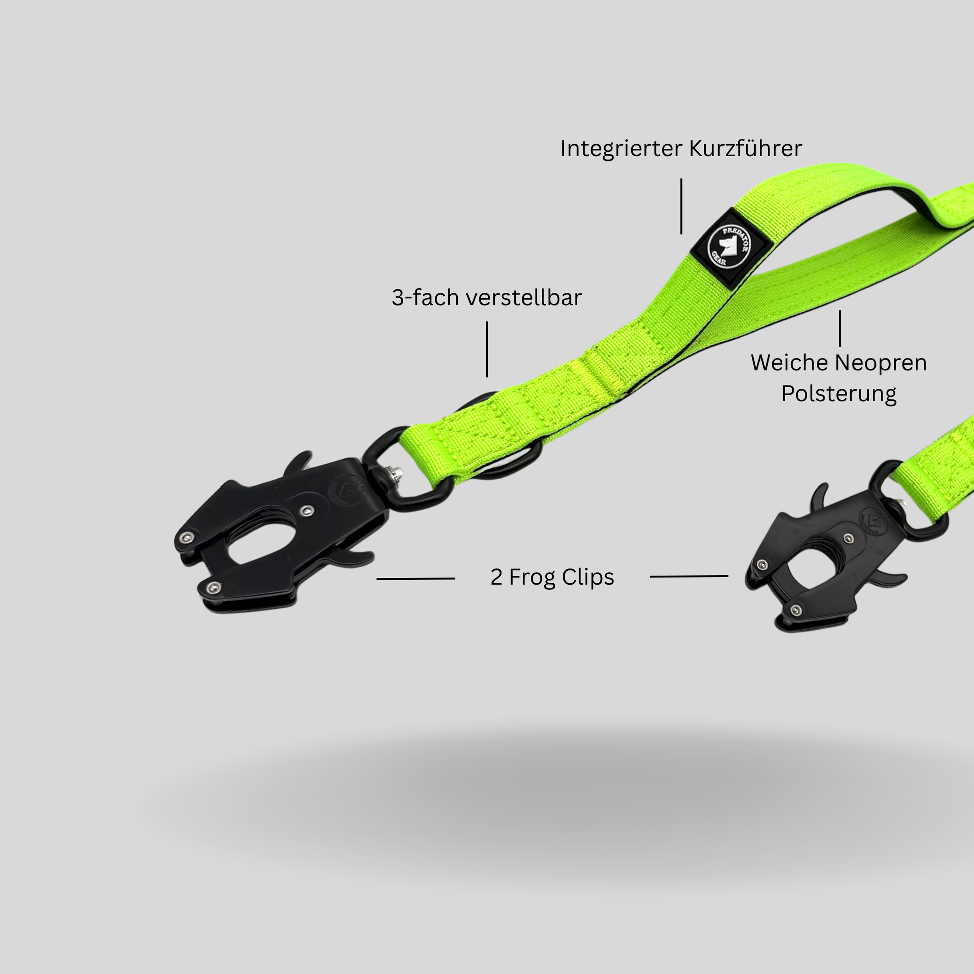 Gefertigt aus robustem Nylon mit Neopren-Komfortpolsterung und 2 charakteristischen Froschkarabinern, ist sie mehr als nur eine Leine - sie ist Teil deiner Ausrüstung. Der hochwertige Verschluss rastet bei Berührung mit dem Anschlagpunkt automatisch ein - für schnelle einhändige Sicherung & starken Halt auch unter Zug oder in kritischen Momenten.